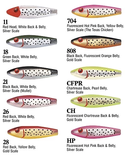 This lure resembles a Trout fingerling, a natural baitfish for inshore game fish. The TTR features permanent “built-in” spots which will not scratch off – permanent, and fish calling rattles. This lure can be cast or trolled to catch giant Speckled Trout, Striper, Tarpon and Redfish.